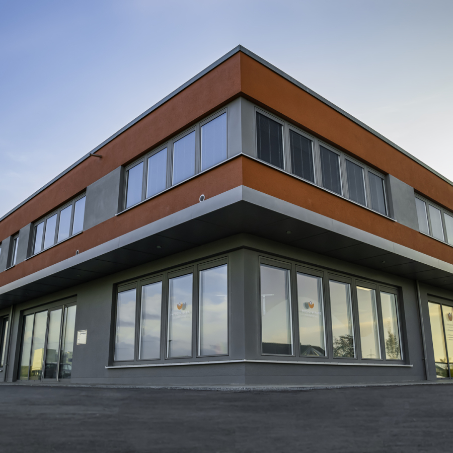 Das Gebäude besicht durch seine moderne, kompakte und wirtschaftliche Bauweise. Das Gebäude ist mit einem Flachdach und einer PV-Anlage konzipiert sowie mit hochwertigen Materialien umgesetzt. Die Erschließung erfolgt von Süd-Westen. Die Baukörperkubatur ist funktional sowie geradlinig gewählt und positioniert sich mittig im Baufeld. Umliegend finden sich die KFZ-Stellplätze für Besucher, Angestellte oder Kunden mit bestmöglicher kurzer Wegeführung zu den jeweiligen Gewerbeeinheiten. Die Struktur des Baukörpers ist offen, mit einem tragenden Stützen-system entwickelt, sodass sich die Gewerbeflächen flexibel gestalten lassen. Die Schaufensterfronten orientieren sich zur Hauptverkehrsachse in Richtung des Gewerbegebiets, sodass eine variable Nutzung der Gewerbeeinheiten ermöglicht bleibt. Durch komfortable großflächige Fensterfronten erhalten die Räum-lichkeit einen hohen Qualitätsstandard, ausreichend Belichtung und den Sichtkontakt zu Kunden und Besuchern.