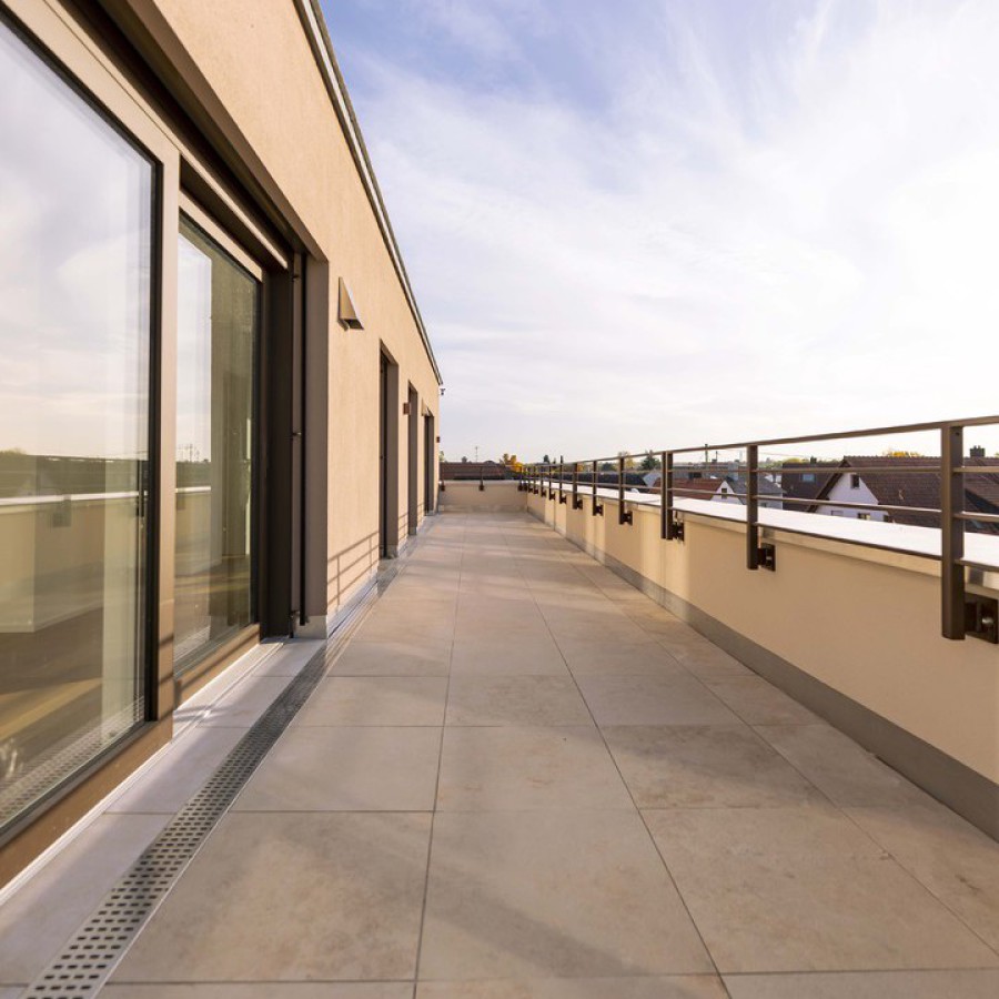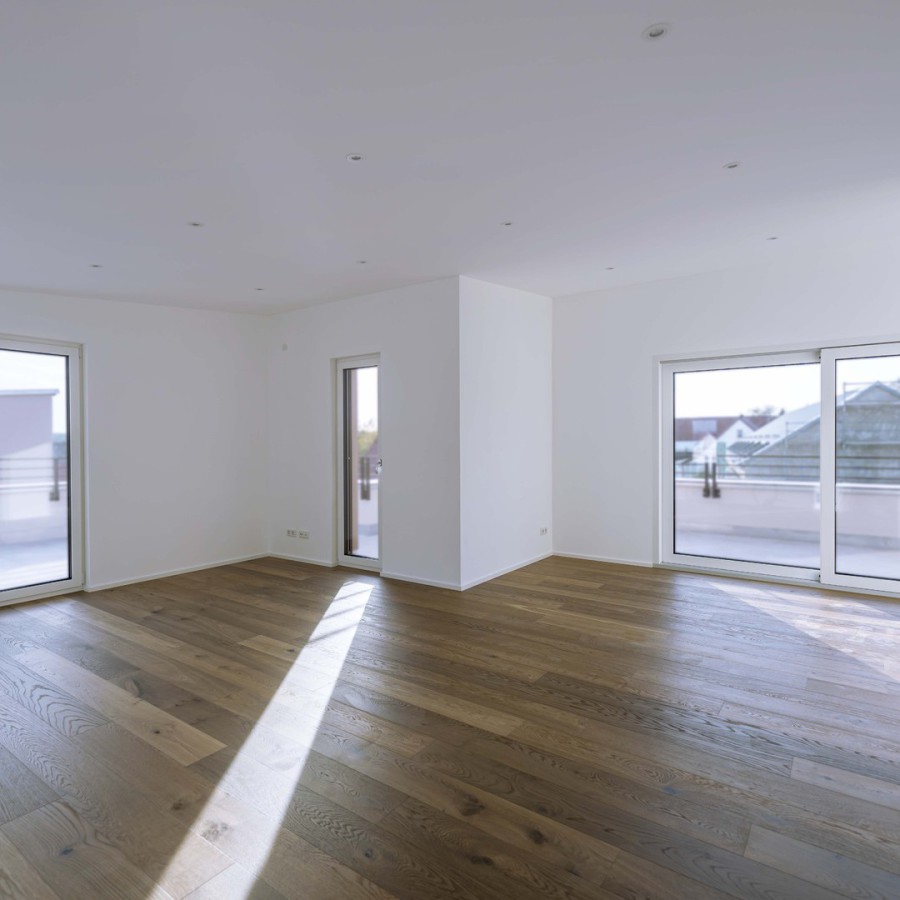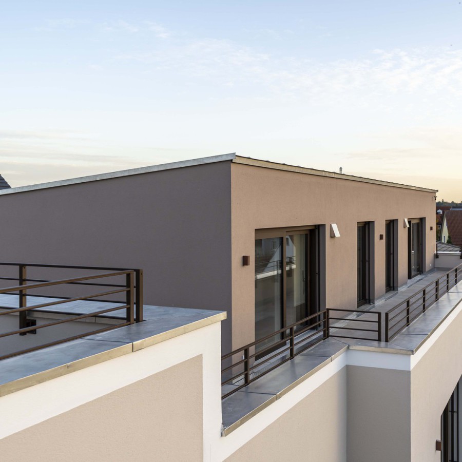 Das zurückgesetzte Dachgeschoss mit einem flach geneigten Pultdach spiegelt die moderne Architektur wieder. Die umlaufende Dachterrasse mit Westausrichtung bietet ein exklusives Wohnerlebnis. Die großzügigen bodentiefen Fensteröffnungen bieten höchsten Wohnkomfort. Der Baukörpergrundriss positioniert eine 2-Zimmerwohnung im östlichen Flügel und eine 3-Zimmerwohnung im westlichen Flügel.