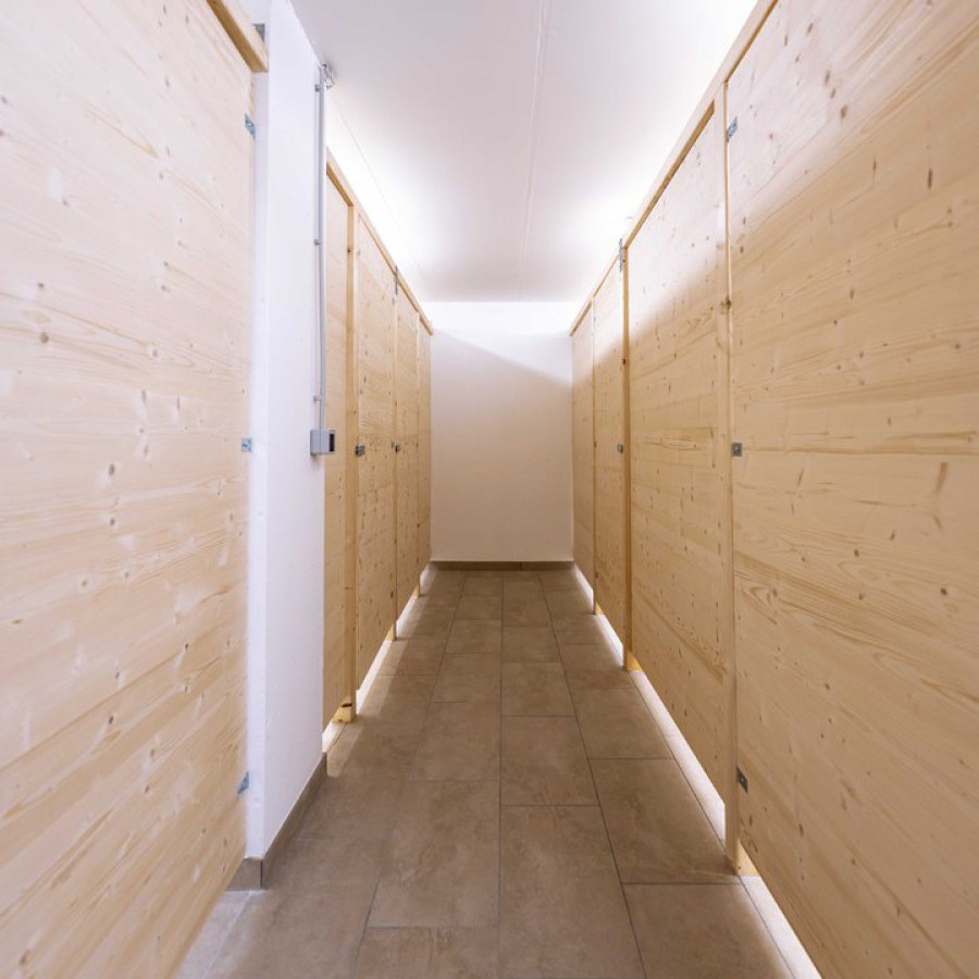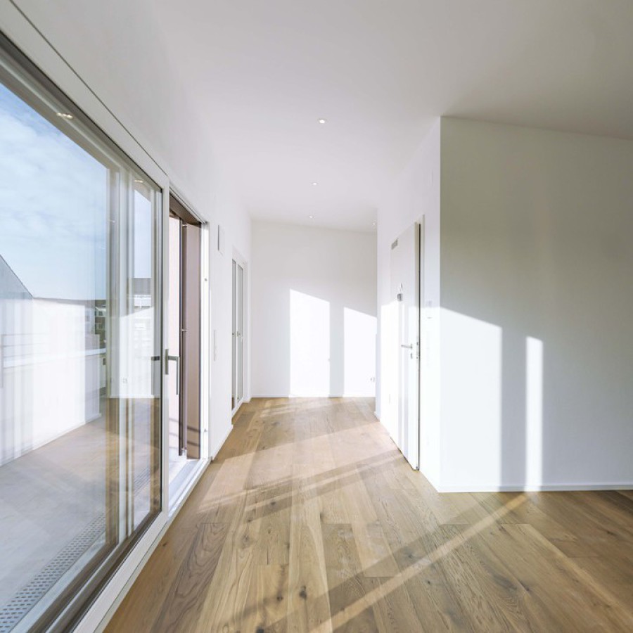 Die Auswahl von hellen Materialien lassen die Räume groß und freundlich wirken. Die bodenteifen Fenster unterstreichen die moderne einladende Architektur. Die Ausrichtung der Räume positioniert sich nach Süden und Westen, sodass eine optimale Belichtung ermöglicht wird.